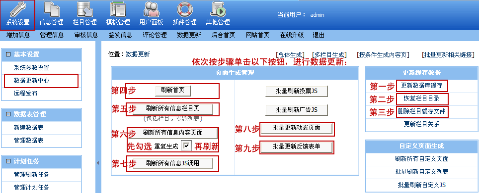 | 5、 | 單擊“刷新所有信息欄目頁”按鈕 | 出現(xiàn)信息提示:“刷新所有信息列表成功”即可; |