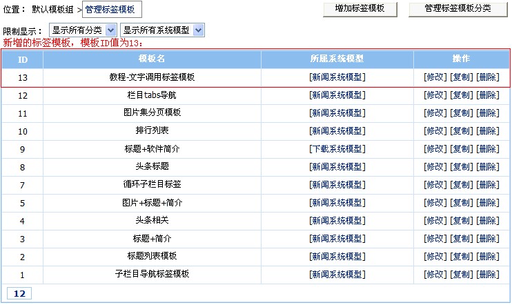 即標(biāo)簽?zāi)0宓腎D值,是我們在帝國CMS后臺(tái)增加標(biāo)簽?zāi)0搴�,由CMS系統(tǒng)自動(dòng)分配的。一個(gè)標(biāo)簽?zāi)0鍖?duì)應(yīng)一個(gè)ID。