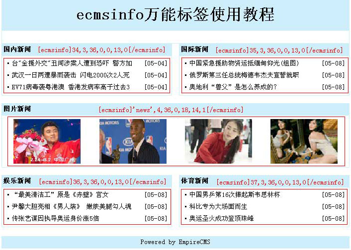 | ecmsinfo標(biāo)簽與其它信息調(diào)用標(biāo)簽唯一不同的是:顯示樣式由標(biāo)簽?zāi)0鍥Q定。 |