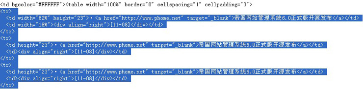 | 由于調(diào)用內(nèi)容的3條信息,具有相同顯示樣式(文字調(diào)用樣式),所以我們只需要取一條信息的顯示樣式代碼做為模板代碼就可以了, |