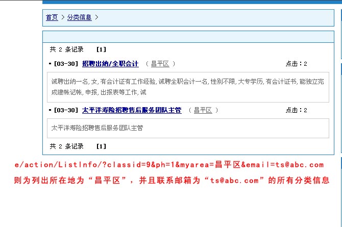 | 附加說明:上面舉例的是選擇完全匹配方式,也可以選擇模糊匹配方式,模糊匹配則只要包含字符值即可符合條件。例:“e/action/ListInfo.php?classid=9&ph=1&email=abc.com”就能列出郵箱地址中包含“abc.com”字符的的所有分類信息。 |