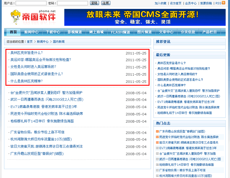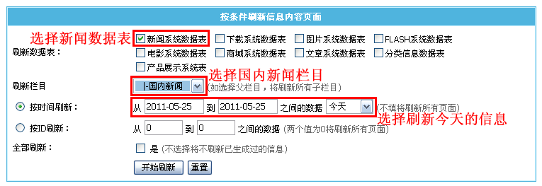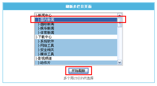 | 2、生成欄目頁:“刷新多欄目頁面”選擇“國內(nèi)新聞”這個欄目,然后點擊“開始刷新”。 |