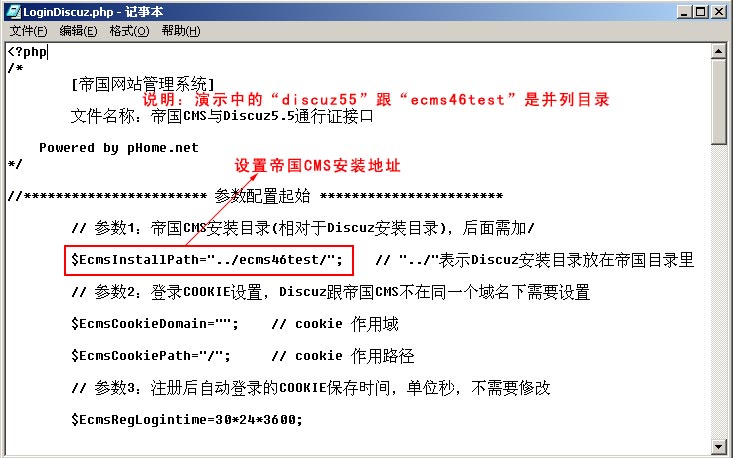 用記事本打開程序包里的LoginDiscuz.php文件,然后設(shè)置“帝國CMS安裝地址”參數(shù)并保存文件,如下圖: