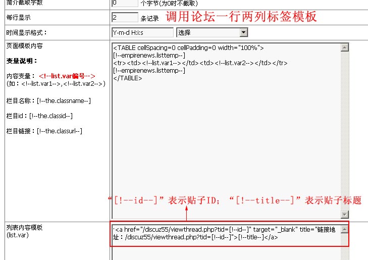 3、制作顯示樣式模板 在標(biāo)簽?zāi)0逯杏?ldquo;[!--title--]”貼子標(biāo)題;“[!--id--]”表示貼子ID。