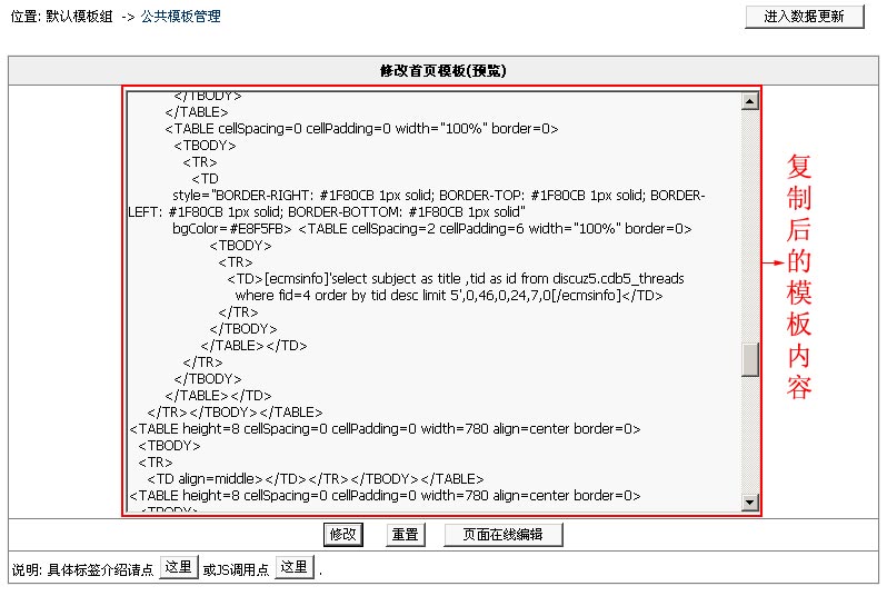4、現(xiàn)在我們修改首頁(yè)模板: 登陸后臺(tái)->"模板管理"->"公共模板"->"修改首頁(yè)模板",將模板內(nèi)容復(fù)制到dreamweaver編輯,在模板中加入調(diào)用論壇貼子的標(biāo)簽,如下圖: (說明:其中“where fid=版塊ID”為按論壇版塊調(diào)用貼子。) 圖1:(在dreamweaver中的首頁(yè)模板)