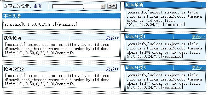 原理說明: 通過ecmsinfo標(biāo)簽與按SQL調(diào)用相結(jié)合實(shí)現(xiàn)論壇數(shù)據(jù)調(diào)用。