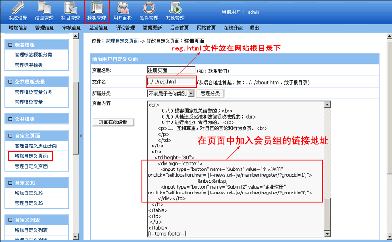 ”,增加一個自定義頁面,加入會員組的注冊地址,如下圖: