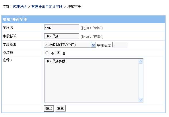 (1)、后臺>"評論管理">"自定義評論字段">"增加字段",進(jìn)入如下界面增加字段: