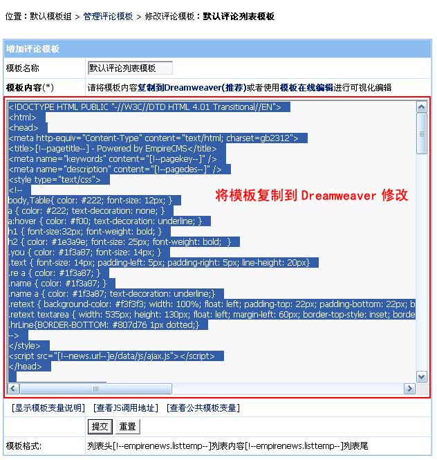 (2)、將模板復(fù)制到Dreamweaver修改: