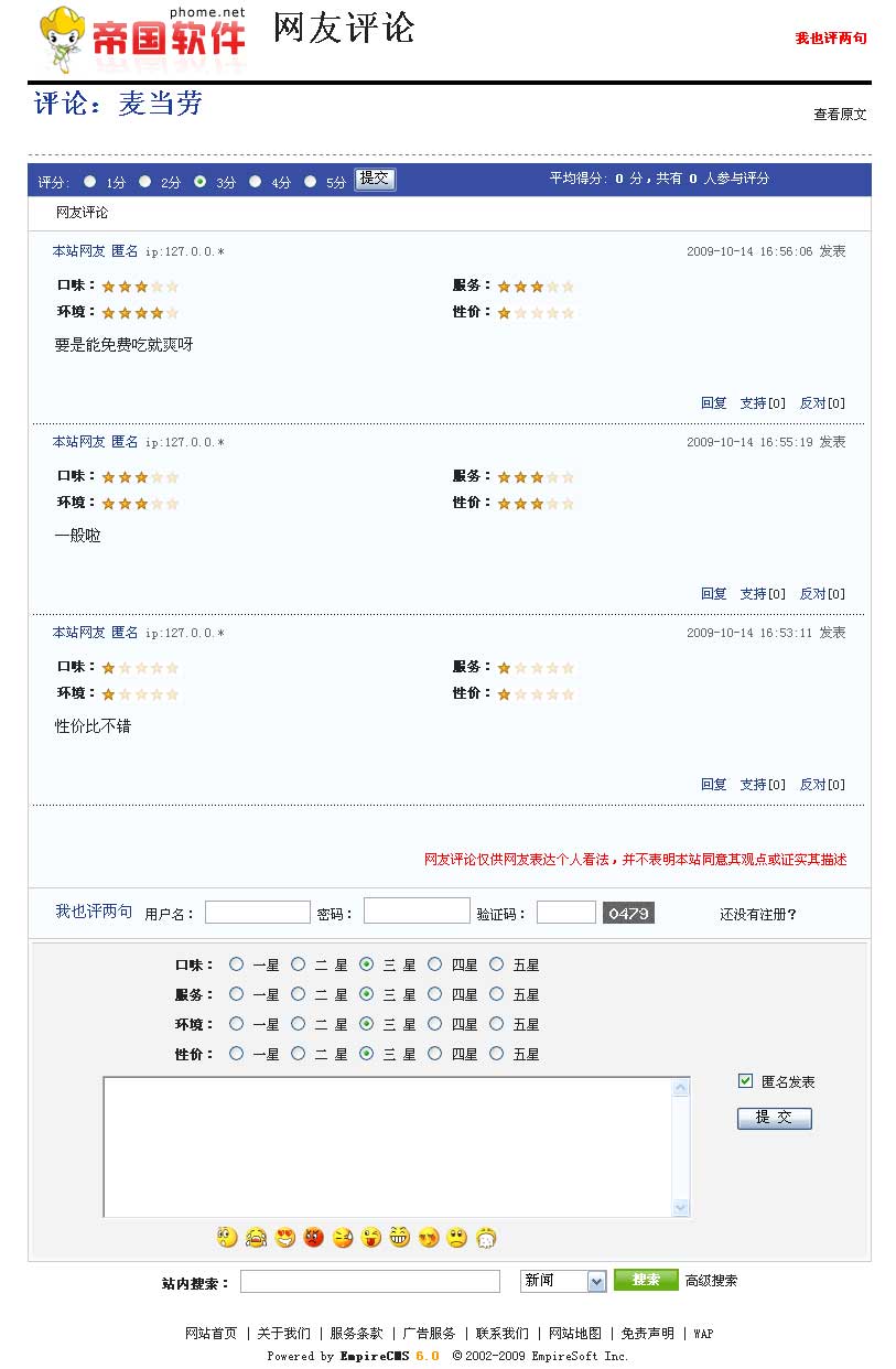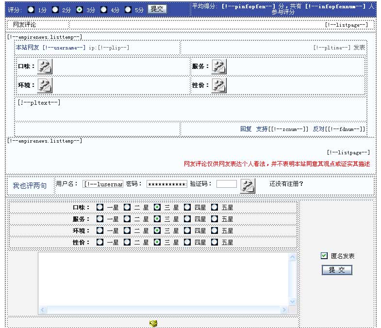首先后臺增加評論字段,然后修改評論模板即可:評論表單元素可任意,只需變量“name=字段名”,顯示評論字段內(nèi)容用“[!--字段名--]”。