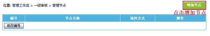 | 4、進入工作流節(jié)點管理頁面,然后點擊“增加節(jié)點”按鈕,進入增加工作流節(jié)點界面: |
