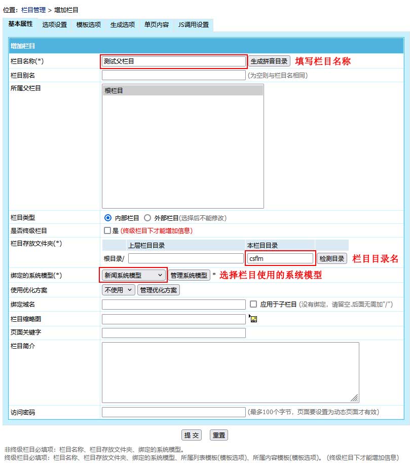 欄目即對網站的內容歸類,帝國CMS支持無限級欄目分類。本文主要介紹增加欄目的基本設置。