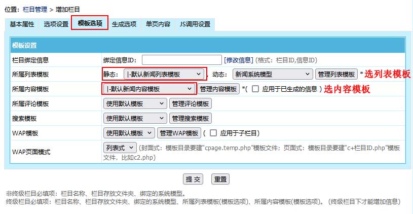 :此類型欄目可實現頻道頁、列表頁、單頁、綁定信息、外部鏈接等。