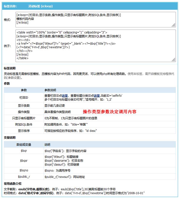 (第3個“操作類型”參數(shù)決定調(diào)用內(nèi)容、以及決定第1個“欄目ID”參數(shù)內(nèi)容。)