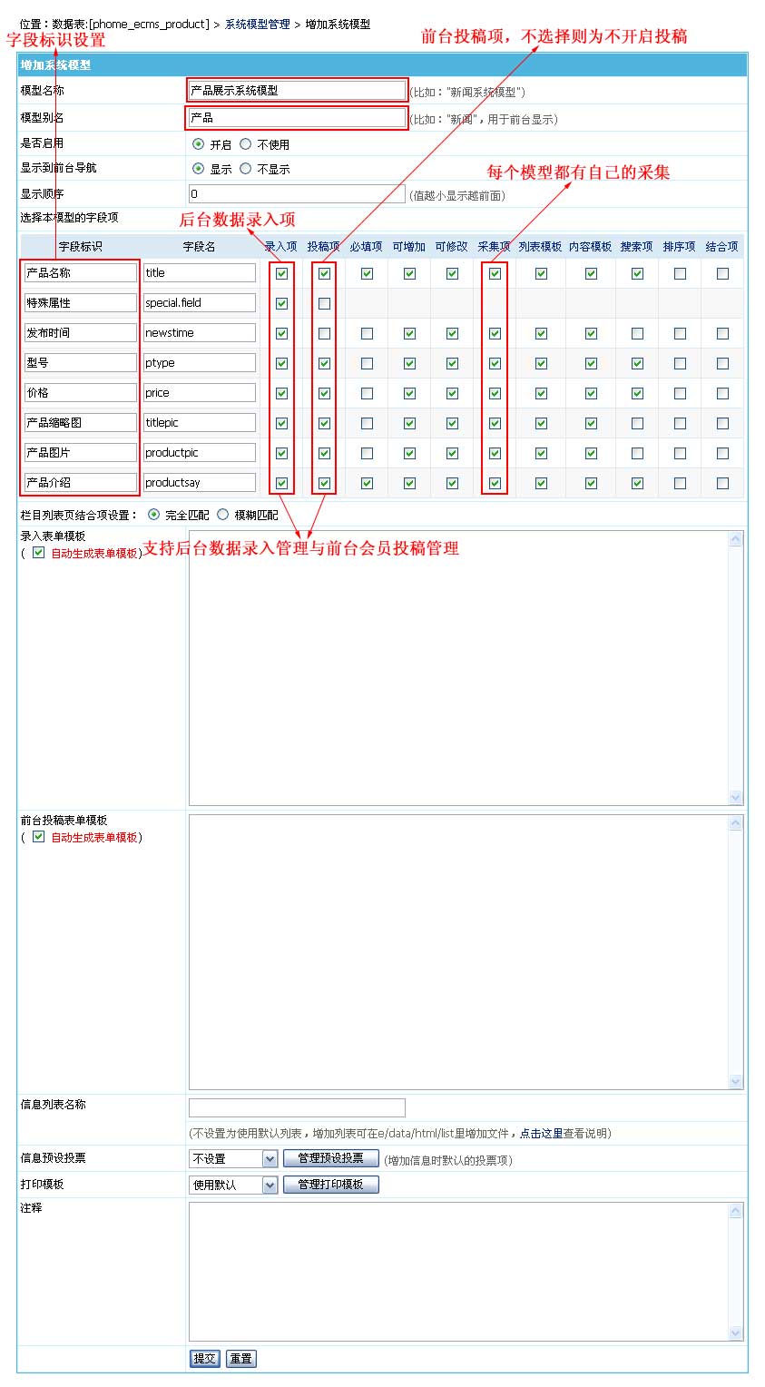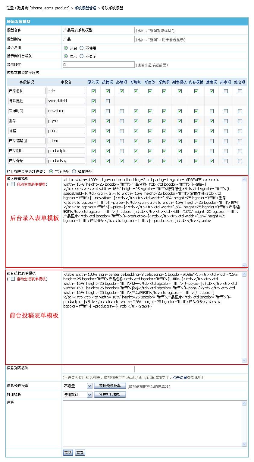 | 1、登錄后臺->“系統(tǒng)”->“數(shù)據(jù)表與系統(tǒng)模型”->“管理數(shù)據(jù)表”->點(diǎn)擊產(chǎn)品數(shù)據(jù)表的“管理系統(tǒng)模型”->“增加系統(tǒng)模型”,進(jìn)入如下界面: |