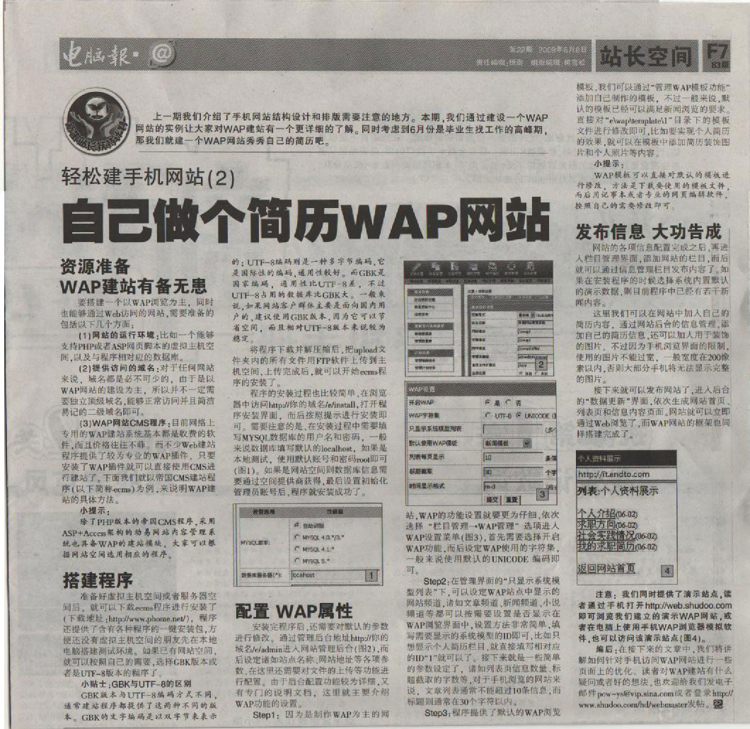 2009年6月8日 《電腦報》第22期 以標(biāo)題為“輕松建手機網(wǎng)站:自己做個簡歷WAP網(wǎng)站”對【帝國CMS】的WAP功能使用進行了報道。