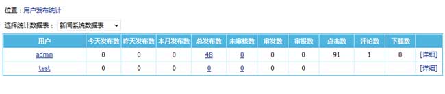 帝國(guó)CMS7.5版用戶發(fā)布信息統(tǒng)計(jì)升級(jí),統(tǒng)計(jì)項(xiàng)更詳細(xì)。讓管理員更方便的查看編輯發(fā)布績(jī)效。
