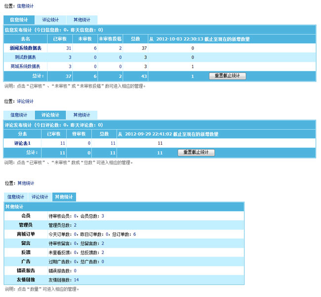帝國(guó)CMS7.0新增統(tǒng)計(jì)最新信息與評(píng)論數(shù)量,讓管理員更方便了解最新?tīng)顩r: