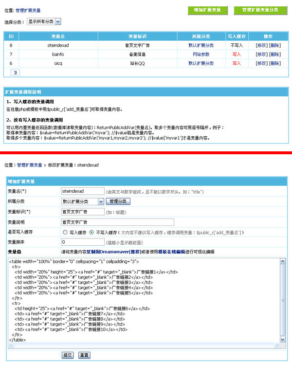 自定義擴展變量功能介紹: (1)、擴展變量支持按分類歸類及顯示。刪除相應(yīng)分類會刪除分類下的變量。 (2)、變量支持是否寫入緩存,如果寫入緩存,在任意php或模板中用$public_addr['add_變量名']可取得變量內(nèi)容。 (3)、內(nèi)置變量返回函數(shù)(數(shù)據(jù)庫讀取變量內(nèi)容):ReturnPublicAddVar(變量名)。取多個變量內(nèi)容可用逗號隔開,例子: 取得單變量內(nèi)容:$value=ReturnPublicAddVar('myvar'); //$value就是變量內(nèi)容。 取得多個變量內(nèi)容:$value=ReturnPublicAddVar('myvar1,myvar2,myvar3'); //$value['myvar1']才是變量內(nèi)容。