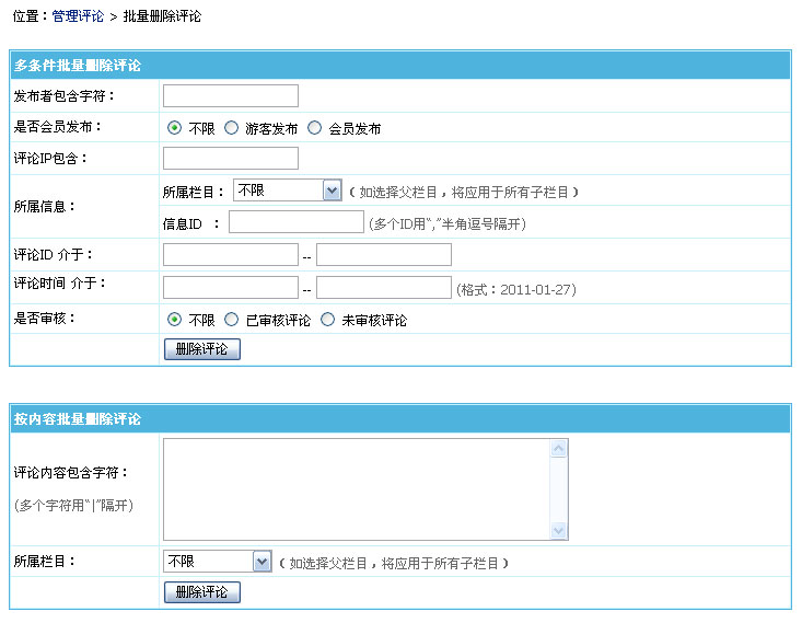 (6)、支持按欄目和信息ID刪除評(píng)論。