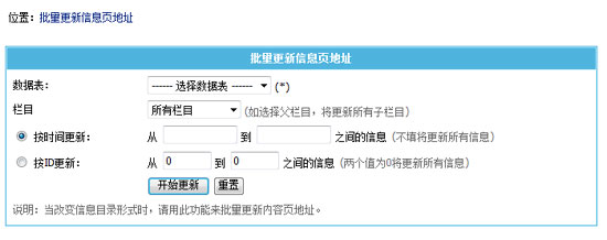為了使擴展更方便、及讓外部程序更容易調(diào)用帝國CMS信息,帝國CMS7.0版本新增了信息地址預(yù)獲取方式,使調(diào)用更方便,效率更高。 在原來版本我們獲取信息要查詢“id,classid,newspath,filename,groupid,titleurl”等字段才能獲得地址。 而在7.0版本只要查詢“titleurl”字段就能獲得地址,因為數(shù)據(jù)庫已經(jīng)直接記錄信息本身的鏈接地址,非常方便。 預(yù)獲取方式也有利于效率提升,不需要查詢多余字段以及計算信息頁地址。 另外,如果要識別鏈接是否為外部鏈接,可查詢isurl字段,當(dāng)isurl=1時就是外部鏈接。 當(dāng)?shù)刂纷兓瘯r后臺也增加了批量重新生成信息地址功能,很方便。