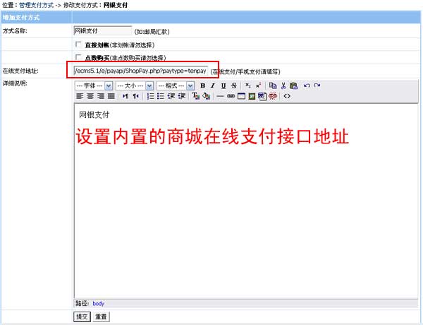 商城支付方式里可設(shè)置內(nèi)置的在線支付接口地址;設(shè)置后購買商品后可直接在線支付